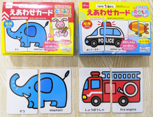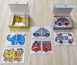 半分のカードから、その動物は「どんな形なのか」その乗物は「どういうものなのか」を想像し、認識面の発達に繋がります。