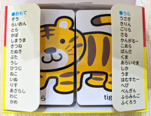 動物や乗物のイラストがカードに描かれていて、2枚で1つの絵になるようになっています。