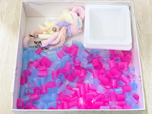 たくさん入れてネックレスみたいに見立て遊びにもなりますし、自分だけのひもに、何度も輪っかを通すとひもの中で輪っかが増えていきます。