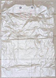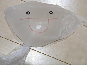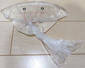 ポリ袋を逆さまにして、上の方にオバケの顔を描きます。