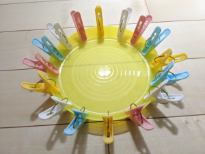プラスチックのお皿の周りに洗濯バサミを挟んだだけですが、これが息子には大ヒットしました。