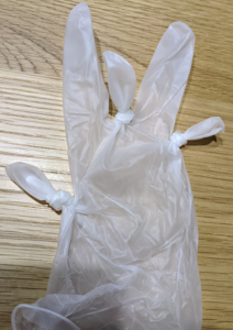 ゴム手袋の「親指」「中指」「小指」の部分に水が入らないように結びます。