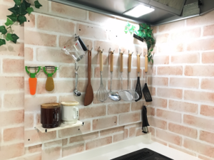 私は、キッチン横の壁にも同じ壁紙を貼り、100均で購入したフェイクグリーン(造花の草)を取り付けました。