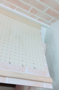 キッチンの壁に壁紙を貼り、そこに強力両面テープで作った有孔ボードを貼りつけます。
